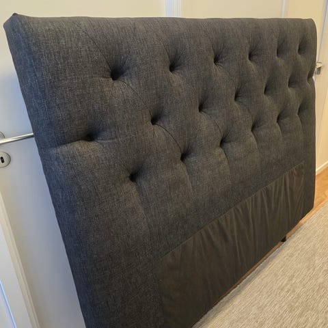 Mio sänggavel i grå sammetstyg. Gaveln har knapptuftad, vadderad front med mjuk stoppning för bekvämt ryggstöd vid sittande i sängen. Passar som huvudgavel till säng och kan kombineras med olika typer av sängramar och madrasser i matchande bredd. Neutralt grå färgton som fungerar i många sovrumsmiljöer.