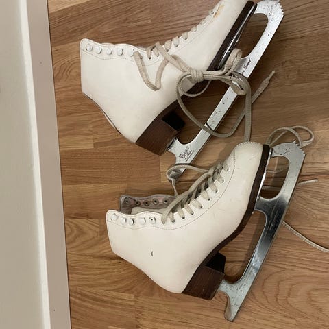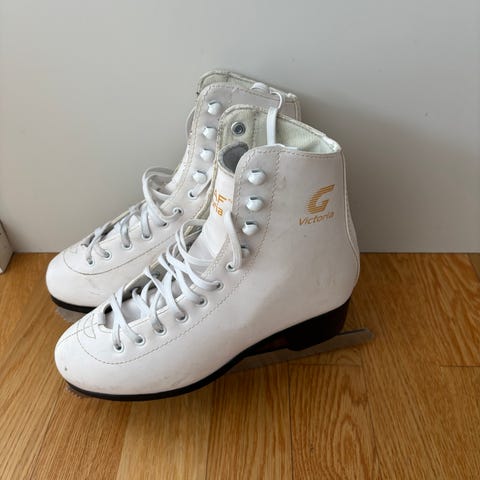 Pros konståkningsskridskor i storlek 38 i vit färg. Klassisk modell med snörning och tåtaggar framtill på skenan. Ovandel i syntetmaterial med vadderad insida för ökad komfort. Yttersula i svart material och metallblad anpassade för konståkning. Passar för barn eller ungdom med skostorlek 38 som vill åka skridskor på isbanor eller i ishall. Medföljer svarta skenskydd med rosa låsclip.