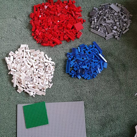 LEGO byggklossar i blandad låda. Innehåller olika typer av klossar i flera färger och storlekar samt en grön byggplatta. Passar för fritt byggande och komplettering av befintliga LEGO-samlingar. Ingår 2 st lego-lådor för förvaring.