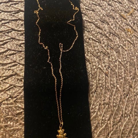 halsband i guld för kvinna. Halsbandet har en kedja med flera hängelement i form av blommor/klöver placerade längs kedjan. Designen ger ett flerskiktsintryck när det bärs. Passar som vardagssmycke eller vid mer uppklädda tillfällen. Exakt guldhalt och vikt framgår inte närmare här utan bör kontrolleras vid behov.