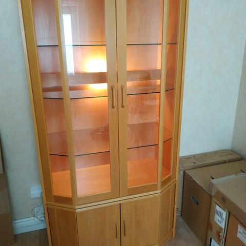Vackert vitrinskåp gjort av gammal byrå och fönster. Inköpt och skapat av Loppisverkstan.