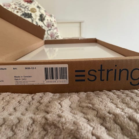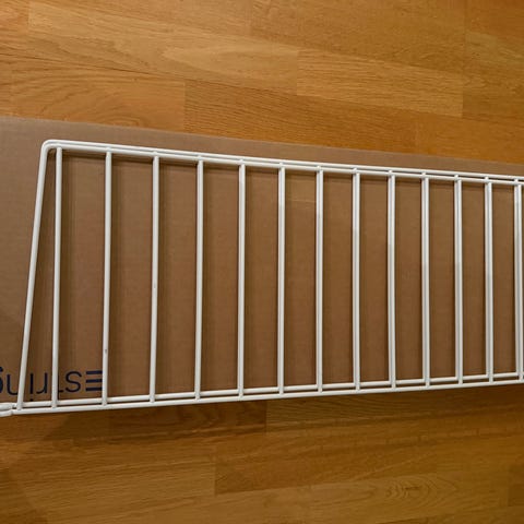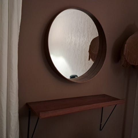 Rosa matt finish. Bra skick. Ett milimeterstort jack i baksidan på ena hyllplanet