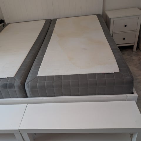 IKEA säng med tillhörande gavlar och två sängbord i vit färg. Sängen består av två resårmadrasser placerade intill varandra. Huvudgaveln är sammanhängande och förbinder sängen med sängborden på båda sidor.