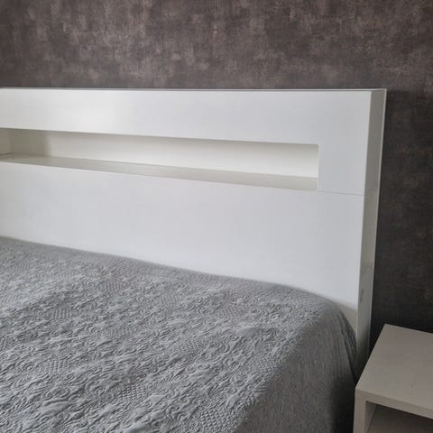 Varje sängbord har två lådor med runda handtag samt ett öppet fack upptill för förvaring av till exempel böcker, glasögon eller mindre saker. Möbelgruppen är utförd i vit yta som ger ett enhetligt uttryck i sovrummet. Passar som komplett lösning för dubbelsäng med integrerad förvaring vid sängens båda sidor.