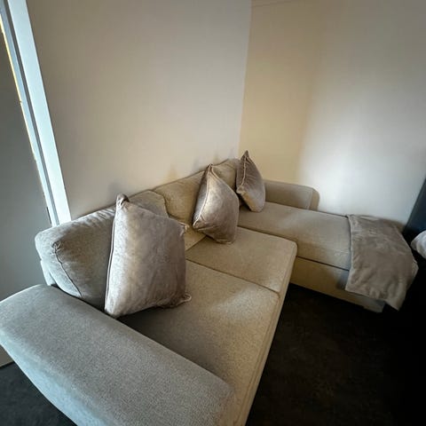Hörnsoffa som kan göras om till bäddsoffa, klädd i ljusblått tyg. Soffan har schäslongdel med förvaringsutrymme under sitsen. Medföljande ryggkuddar i samma tyg. Mått enligt skiss: ca 230 cm bred, 151 cm djup vid schäslong, sitthöjd ca 44 cm. Utdragen som bädd är liggytan ca 140 x 204 cm. Passar som sitt- och sovmöbel i vardagsrum, gästrum eller mindre utrymmen där extra sovplats och förvaring behövs.