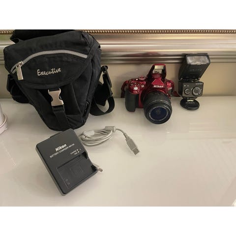 Nikon systemkamera med objektiv i svart färg. Kameran levereras med Nikon-rem runt kamerahuset. På bilden syns även en laddare/nätdel samt en kameraväska i svart tyg med bärrem. Systemkameran är lämplig för allmän fotografering, exempelvis vardagsbilder, resor och hobbyfoto. Objektivet är ett standardzoomobjektiv som passar för många olika motivtyper. Alla delar är avsedda för användning tillsammans med Nikon-kamerahus med kompatibelt fäste.