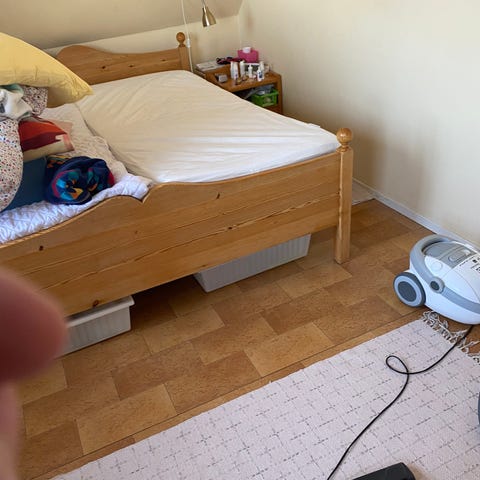 Sängram + 2 st nattduksbord. I bra skick men finns en märke på ramen. Detta syns dock knappt när sängen är bäddad. Se sista bilden. OBS madrasser medföljer ej.