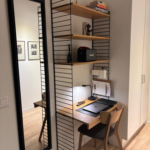 IKEA skrivbord med tillhörande hurts och förvaringshylla i trä, grå ton.