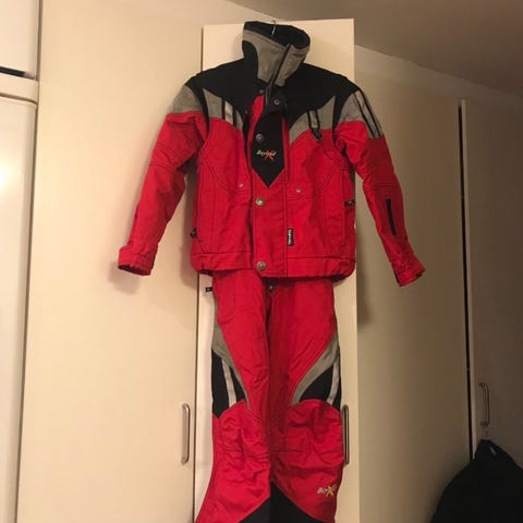 Röd/vit jacka med byxa strl ca 48 (S/M)