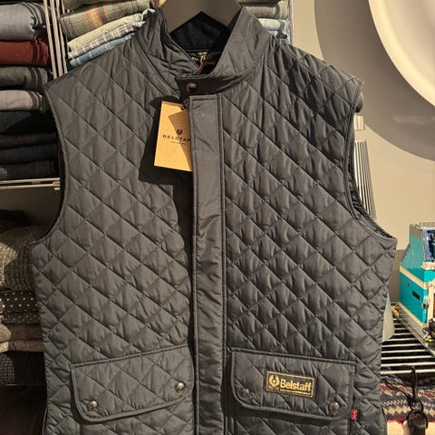 Barbour Defender väst för herr i storlek M. Väst i blå färg med quiltad framsida och hel dragkedja. Innerfoder med Barbour x Land Rover Defender-detaljer. Praktiska fickor med knäppning. Passar som ytterlager eller mellanlager vid utomhusaktiviteter.