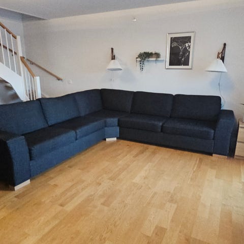 Ekornes: En bekväm hörnsoffa i läder. 2 + 3 sits soffa i äkta läder. Ingen skador på soffan. Perfekt för vardagsrummet. Mått: B 250 cm + 310 cm, höjd 75 cm