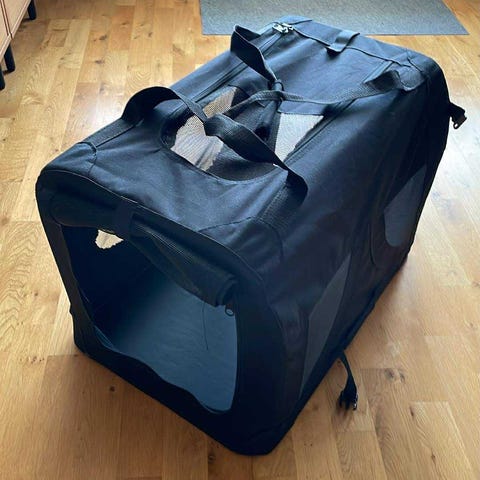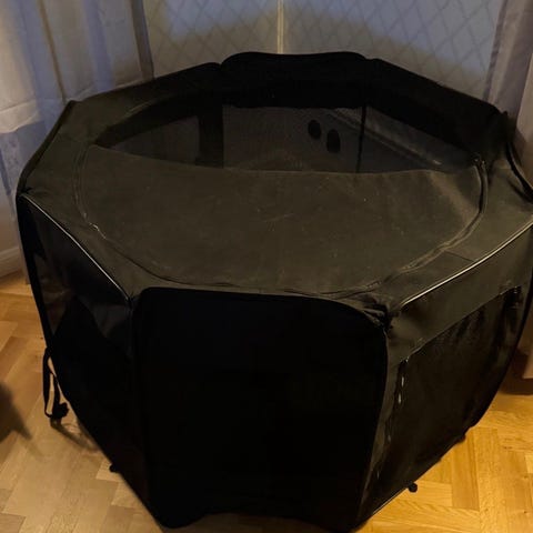 Hundhagen är åttakantig och tillverkad i svart tyg med nätpaneler runtom för ventilation och insyn. Den har öppning med dragkedja samt fickor på utsidan. Tacket går att plocka av. Hagen kan användas inomhus för mindre hundar eller andra smådjur.