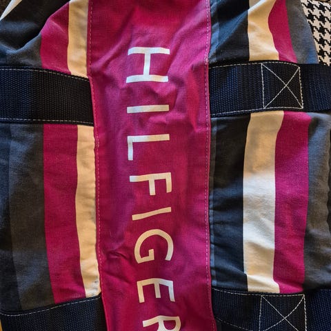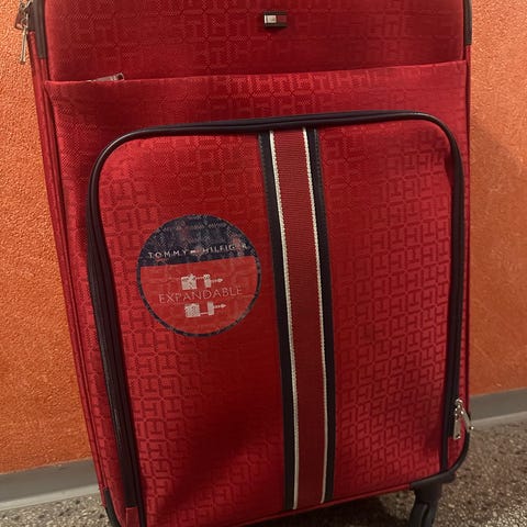 Tommy Hilfiger resväska i hård plast i röd färg med karakteristiska ränder på framsidan. Väskan är utrustad med fyra hjul, teleskophandtag och bärhandtag upptill. Invändigt finns fack med dragkedja och spännband för att hålla packningen på plats. Unisexmodell som passar för kortare resor eller som kabinväska beroende på flygbolagets måttregler.