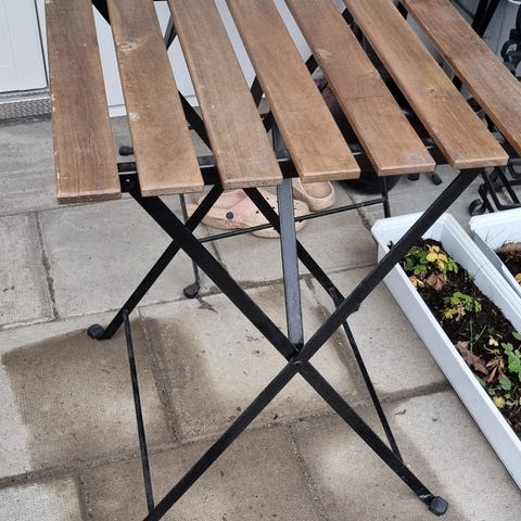 Kvadratiskt balkongbord i vit färg. Bordsskiva med brädliknande utseende och centralt placerat stativ med kryssfot. Passar för användning på balkong, altan eller uteplats som mat- eller avställningsbord för två personer.
