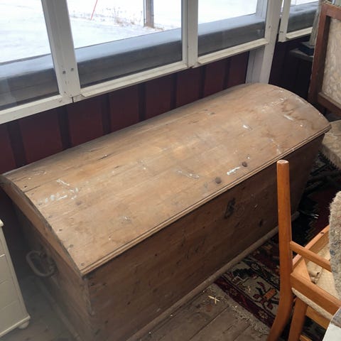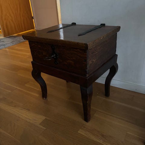 Träskrin/kista i naturfärgat trä med gångjärnsförsett lock.