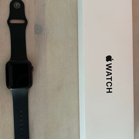 Apple Watch smartklocka med svart armband. Rektangulär pekskärm och justerbart armband i syntetmaterial. Passar för vardagsanvändning med funktioner som tidsvisning, notifieringar och aktivitetsmätning beroende på modell och programvara som används. Kvitto från Netonnet en månad gammal finns