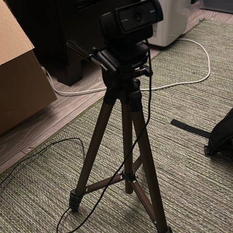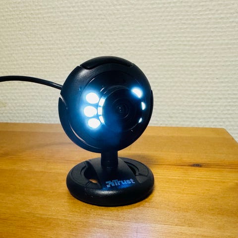 Webbkamera med USB-anslutning i svart färg. Kameran har inbyggt fäste för montering på skärm eller liknande yta. Lämplig för användning med dator för videomöten, videosamtal eller enkel videoinspelning. Ansluts via vanlig USB-kabel. Märke och modell framgår inte tydligt av bilderna.