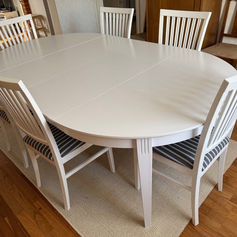Finns lite skav och märken, mest på 2 stolar, men går enkelt att bättringsmåla. Mått 150x105 H=72