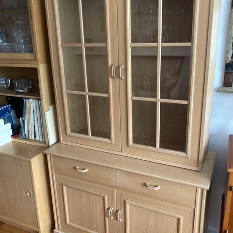 Skåp från Karl Andersson och söner. Svart. Tre hyllplan i glas och två "dolda" hyllplan. Plus ett hyllplan i trä som skiljer det öppna från det slutna (se bild för bättre förståelse).