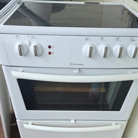 Electrolux spishäll + ugn i vit färg. Äldre fristående modell med ugn och förvaringslåda under ugnen. Utrustad med vred för inställning av värme och ugnsfunktioner på frontpanelen. Fullt fungerande både spishäll och ugn. Några repor på handtag för ugnslucka och förvaringslådan. Ingår tre ugnsplåtar. Säljes pga. renovering av kök/byte av vitvaror.