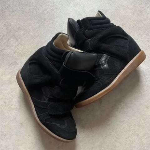 Isabel Marant sneakers i storlek 38. Modellen har kilklack och kardborreknäppning framtill. Skorna är svarta med ljus sula och ljus insida. Passar som vardagsskor eller till mer avslappnade outfits där man vill kombinera komfort med ett mer upphöjt intryck än vanliga sneakers.