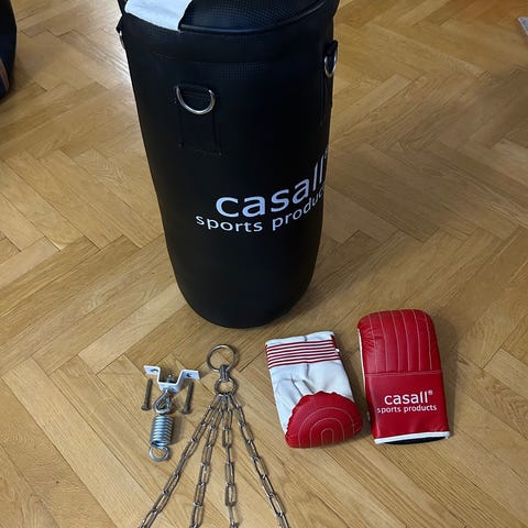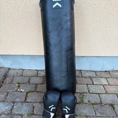 Outshock boxningssäck på fot med tillhörande boxningshandskar i röd färg. Fristående konstruktion med rund bas som kan fyllas för ökad stabilitet. Justerbar stång mellan bas och slagdyna gör att höjden kan anpassas. Slagdynan är avlång och vadderad för slag- och sparkträning. Boxningshandskarna är vadderade och anpassade för träning mot säck. Passar för enklare boxnings- och konditionsträning i hemmet.