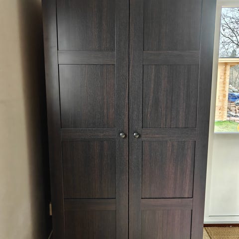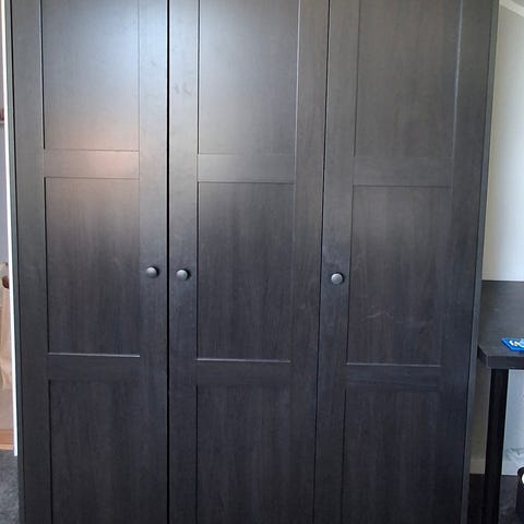 Garderoben är stabil och funktionell, med normalt bruksslitage (se bild). Gott om förvaringsutrymme för kläder och andra tillhörigheter.