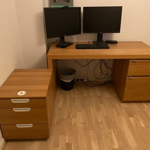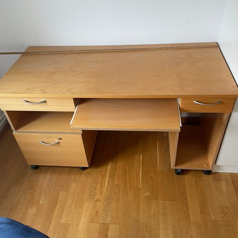 Skrivbord med låda samt utdrag till tangentbordet. Röd bok bra skick.