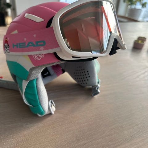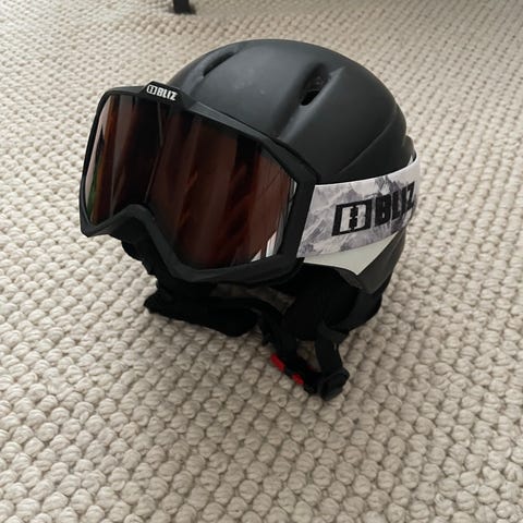 Snygg Sweet protection skidhjälm med tillhörande skidglasögon i blå och orange färg. Hjälmen har justerbart hakspänne och ventilationsöppningar upptill och på sidorna. Utrustningen är avsedd för skidåkning eller snowboardåkning och passar för användning i vintermiljöer.