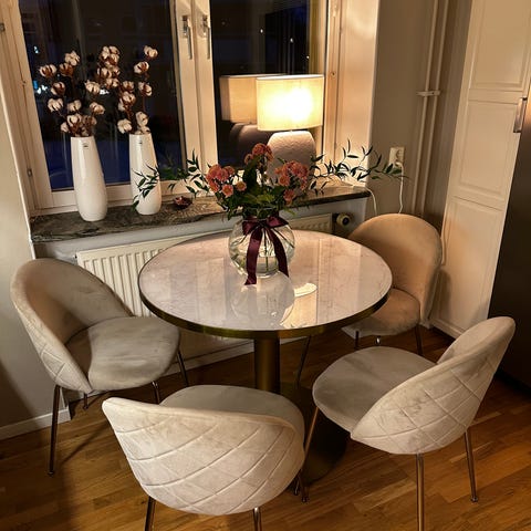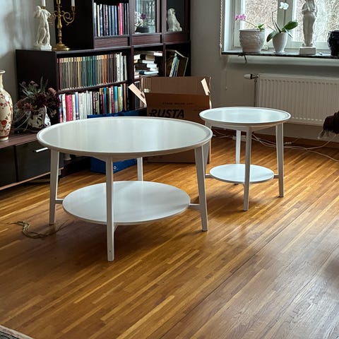 Vitt runt sidobord med marmorerade glasskivor. Inköpt på Mio.