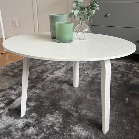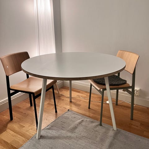 Litet runt matbord. Möjligt att använda både inne och ute, är därför väldigt slittåligt. Vi har använt det inne och är i bra skick förutom några små jack som syns på bilden. Nypris 4900 kr.