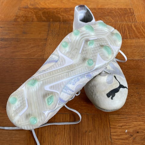 Puma fotbollsskor med snörning. Skorna är vita med röda detaljer och har fasta dobbar anpassade för spel på naturgräs eller liknande underlag. Ovandelen är i syntetmaterial och sulan är utformad för grepp och stabilitet vid fotbollsspel. Storlek 36 EUR.