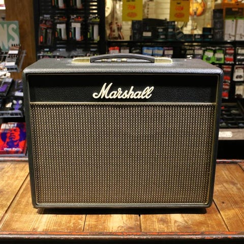 Marshall rörgitarrförstärkare i combo‑utförande. Förstärkaren har klassiskt Marshall-utförande med svart kabinet och guldfärgad kontrollpanel på ovansidan. På framsidan finns flera rattar för volym och tonkontroll samt ingång för elgitarr. Baksidan har anslutningar för ström och högtalare samt ventilationsgaller framför högtalaren. Utrustad med bärhandtag upptill för enkel transport. Passar för elgitarrspel i hemmet, övningslokal eller mindre sammanhang.