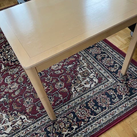 Matbord, Perstorp. 89-148 cm bred. 69 cm djup. Väl använt och lite ”vobbligt” i utfällt läge (se bild). Går säkert att fixa för den händige. Ena sidan har förlorat lite av laminatet (se bild).
