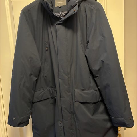 Dunjacka i parkasmodell. Marinblå med huva med avtagbar krage i fuskpäls. Nyskick. Använd endast en gång för att prova. Säljes pga fel storlek.