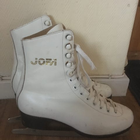 Jofa ishockeyskridskor i svart färg med gröna skosnören som sticker ut. Klassisk modell med vit skena och högt skaft för stöd runt fot och vrist. Passar för ishockey och allmän åkning på is.