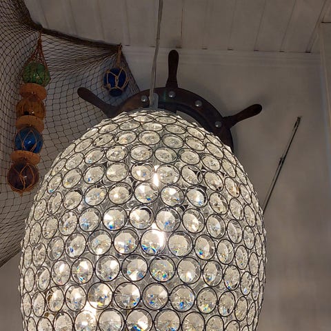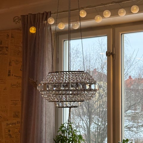 • Design: Rund spegelblank bas i krom med hängande kedjor av slipade kristallkulor.