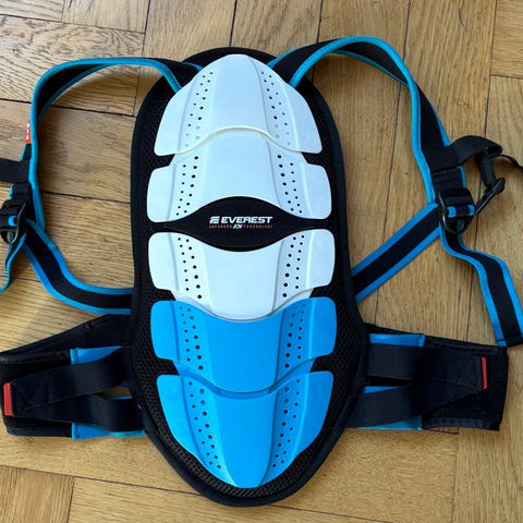 Everest ryggskydd i storlek XXS (128–140 cm). Skyddet har hårda vita plastpaneler på utsidan och vadderad insida i svart textil med blå kant. Justerbara elastiska axelband och midjerem ger möjlighet att anpassa passformen. Avsett som ryggskydd vid skidåkning.