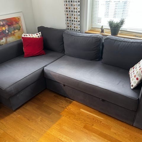Enkel bäddsoffa från IKEA. Jag tror det är modell Friheten eller Bårslöv. Divanen, som går att ha som förvaring, är ca 150 djup och 90 bred.