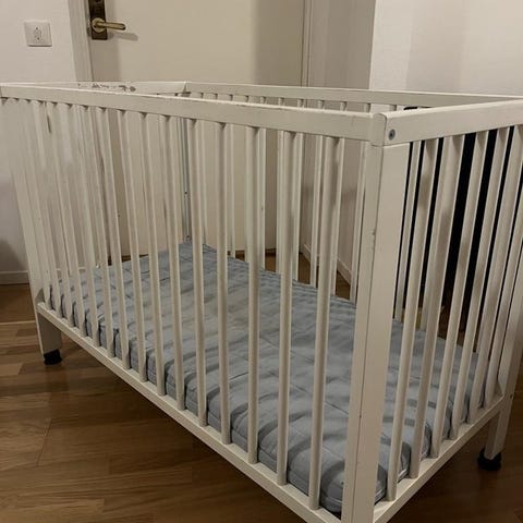 Fin och välgjord barnsäng i trä, 40-tal. Använd av oss fram till förra veckan, Mässingsbeslag, avtagbar långsida. Udda madrassstorlek (65x155). Madrass( (utan överdrag, det har kommit bort) medföljer. Vitmålad av tidigare ägare, skulle nog må bra av ommålning. Först till kvarn, finns i Västertorp.