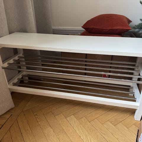 Perfekt i hallen som både sittbänk och skohylla. Stabil och i bra bruksskick, varsamt använd.