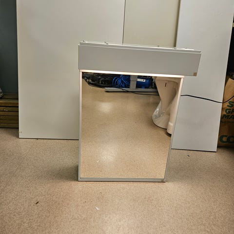 Kvalitativt platsbyggd badrumsskåp med spegeldörrar på båda sidor med integrerad belysning och eluttag nedtill (behöver ej användas)