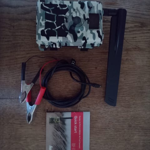 Uovision åtelkamera med antenn i kamouflagefärg. Kameran har frontmonterad lins, rörelsesensor och statusindikator på framsidan. På baksidan finns fästen för rem eller band för montering på träd eller stolpe. Insidan har batterifack för flera batterier, plats för minneskort samt en liten display och knappar för inställningar. Lämplig för övervakning av vilt eller område utomhus där rörelser behöver dokumenteras med bild eller video.