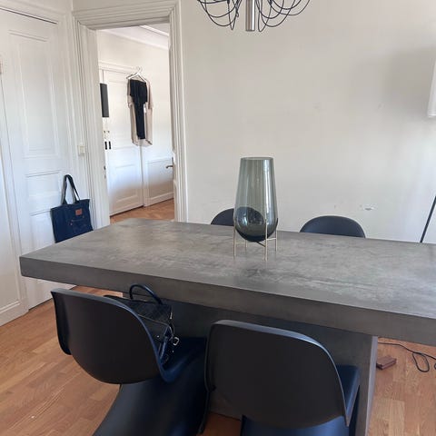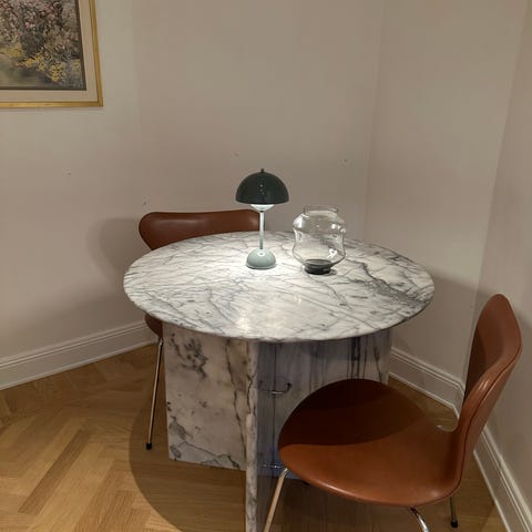 Nordiska Rum. bordet är jätte fint med äkta marmor, det finns en spricka i stenen inget som syns bara om man känner med fingret på själva sprickan. Det påverkar inte funktionen på bordet därav priset.. jag har använt plast på bordet så stenen är super fin! jag säljer den för jag vill ha ett runt matbord passar bättre i min lgh.
