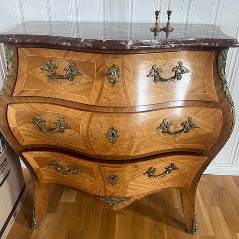 En antik ljus brun byrå med marmorskiva.