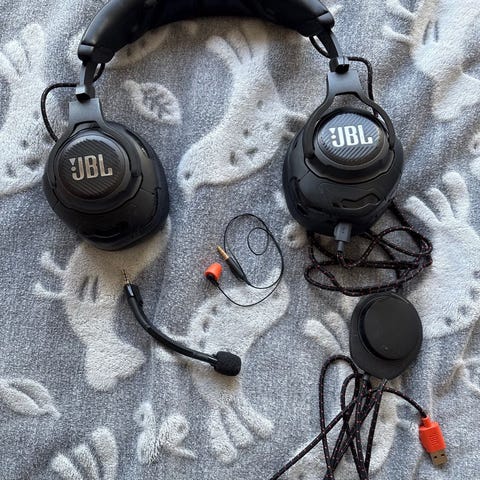 JBL headset med mikrofon i svart färg. Over-ear-modell med vadderade kåpor och justerbar huvudbygel för bekväm passform. Utrustat med bommikrofon och kabelanslutning. Lämpligt för användning vid dator, spel, röstchatt och videosamtal.