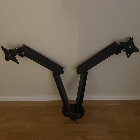 Dubbelt bildskärmsstativ i svart metall för montering av två skärmar. Fästs i bordskant med klämma. Armen är justerbar i sidled och höjd. Går att dra sladdar genom stolpen.
