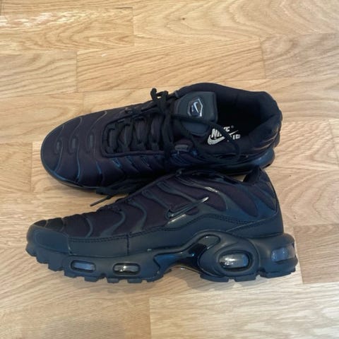 Nike Air Max Plus sneakers i storlek 42. Färgkombination vit och svart med karakteristiskt mönster på ovandelen. Modellen har synlig Air Max-dämpning i sulan och snörning framtill. Passar som vardags- och fritidssko. Extra skosnören ingår.