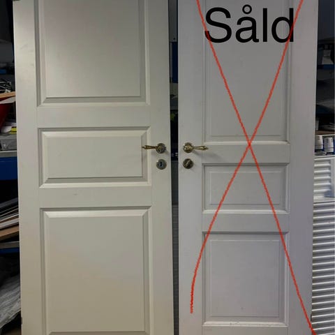 En dörr är hel med tre speglar och två dörrar har glaspartier med rutindelning i den övre delen och spegel i den nedre. 62x200. Passar som innerdörrar i bostad, exempelvis mellan rum eller som pardörrar där man vill släppa igenom ljus mellan rummen. Dörrarna är målade i vitt och har urtag för handtag och lås.