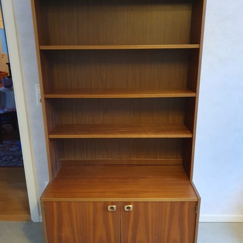 Bokhylla i trä med underskåp som går att låsa (nyckel följer med). Skicket är bra öven om det finns spår av användning.